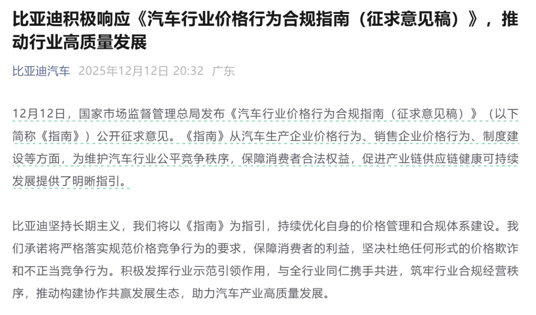比亞迪方面表示, “將以《指南》為指引,持續(xù)優(yōu)化自身的價(jià)格管理和合規(guī)體系建設(shè)。我們承諾將嚴(yán)格落實(shí)規(guī)范價(jià)格競(jìng)爭(zhēng)行為的要求,保障消費(fèi)者的利益,堅(jiān)決杜絕任何形式的價(jià)格欺詐和不正當(dāng)競(jìng)爭(zhēng)行為。積極發(fā)揮行業(yè)示范引領(lǐng)作用,與全行業(yè)同仁攜手共進(jìn),筑牢行業(yè)合規(guī)經(jīng)營(yíng)秩序,推動(dòng)構(gòu)建協(xié)作共贏發(fā)展生態(tài),助力汽車產(chǎn)業(yè)高質(zhì)量發(fā)展。”