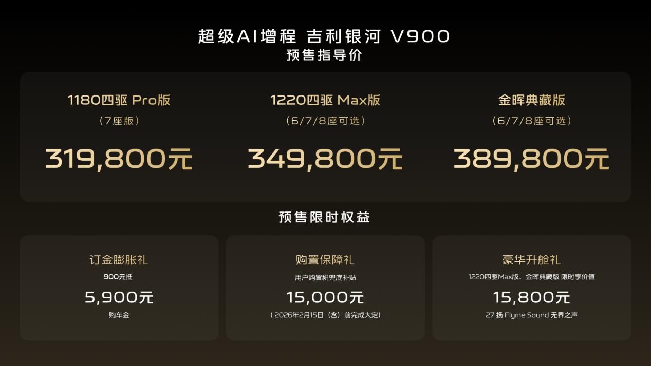 1月7日,吉利銀河旗下V系列的首發(fā)之作,“AI全場(chǎng)景家庭旗艦MPV”——吉利銀河V900正式開啟預(yù)售,共計(jì)3個(gè)版本,預(yù)售指導(dǎo)價(jià)格區(qū)間為31.98萬(wàn)元~38.98萬(wàn)元。新車圍繞中國(guó)大家庭出行的真實(shí)需求,以寬奢空間、豪華駕控、全維安全、AI智能幾大全能滿配實(shí)力,重新定義豪華旗艦MPV價(jià)值標(biāo)準(zhǔn),樹立AI全場(chǎng)景豪華出行新高度。