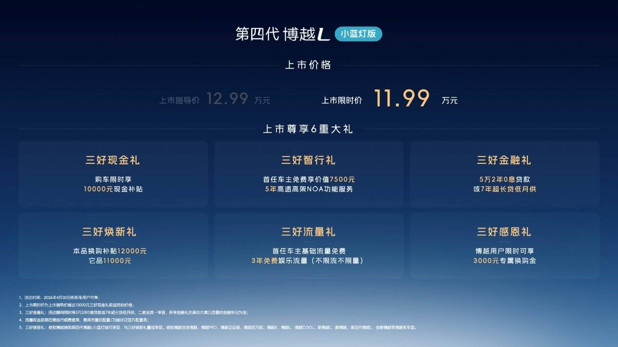 即日起至4月30日,用戶購買第四代博越L小藍燈版可限時享換購補貼12000元,博越用戶換購還可疊加3000元專屬換購金,此外還有7年超長貸等金融禮、流量禮、智行禮共計6重上市大禮。